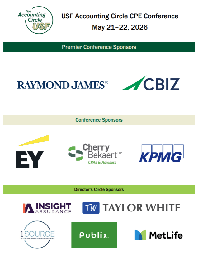Each year, AC@USF hosts its annual CPE conference, a premier event that brings together professionals from across the region. Join us in person on Thursday, May 21, for a full day of CPE culminating in a networking reception. Then, continue with us for our virtual day on Friday, May 22. Your sponsorship is vital to the success of both the conference and the School. Please review the letter below for more details on this opportunity.